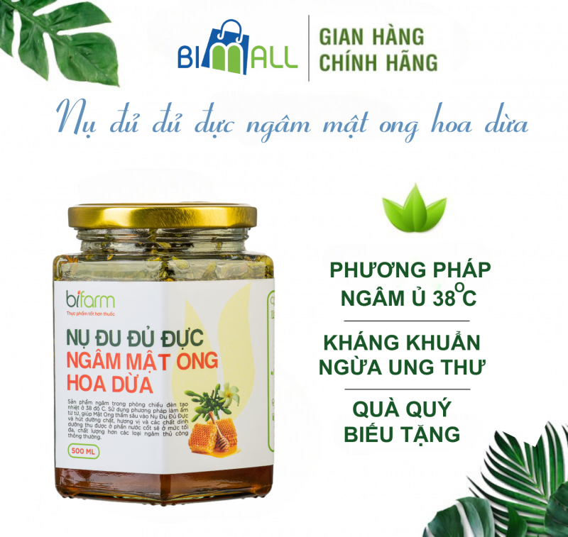 Thành phần: Nụ Đu Đủ Đực sấy lạnh thanh trùng ngâm cùng mật ong Hoa Dừa ở điều kiện chiếu nhiệt 38 độ C